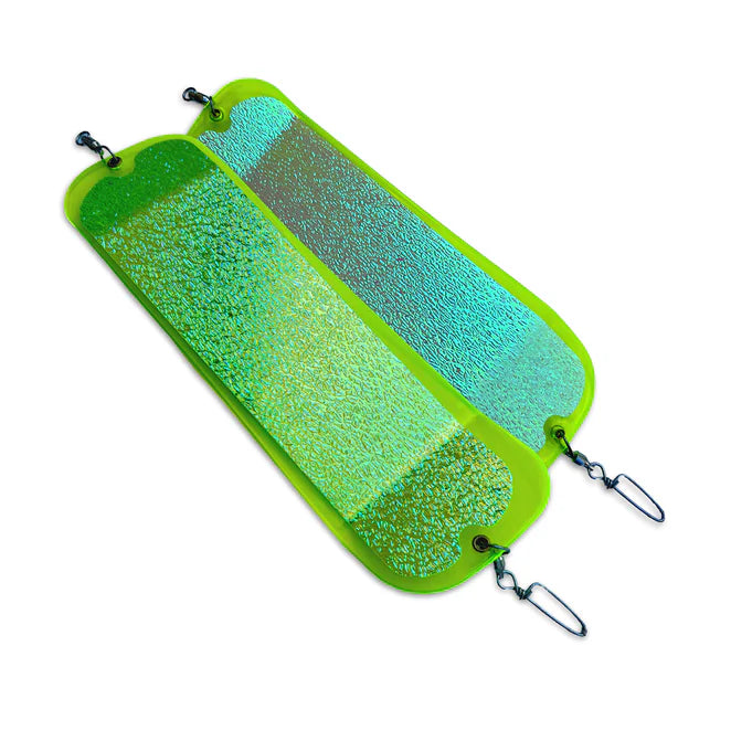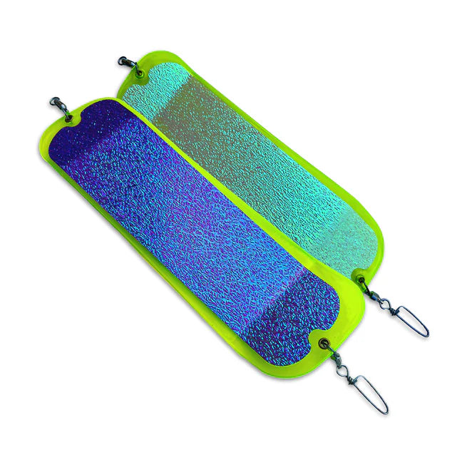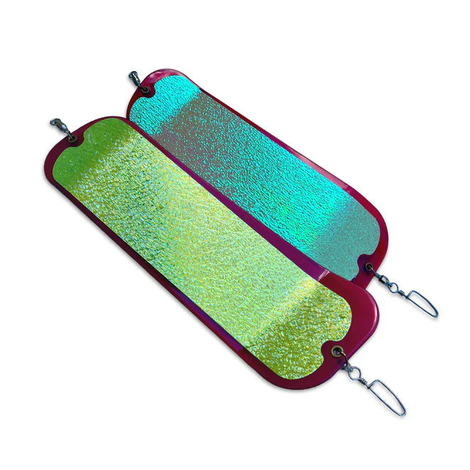 Available in three eye-catching blades—UV Green Jellyfish, UV Jellyfish, and UV Purple (Raspberry)—with four unique tape variations. These flashers feature highly reflective crinkle UV tape and vibrant Glow tape backs for unmatched visibility and attraction.